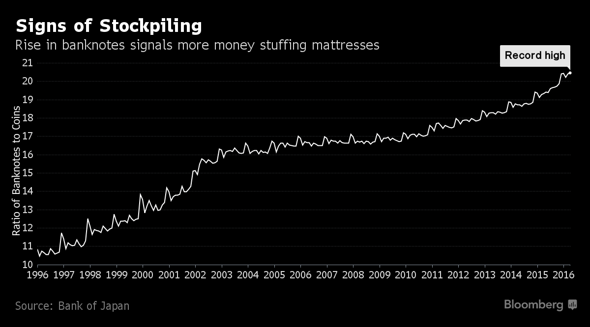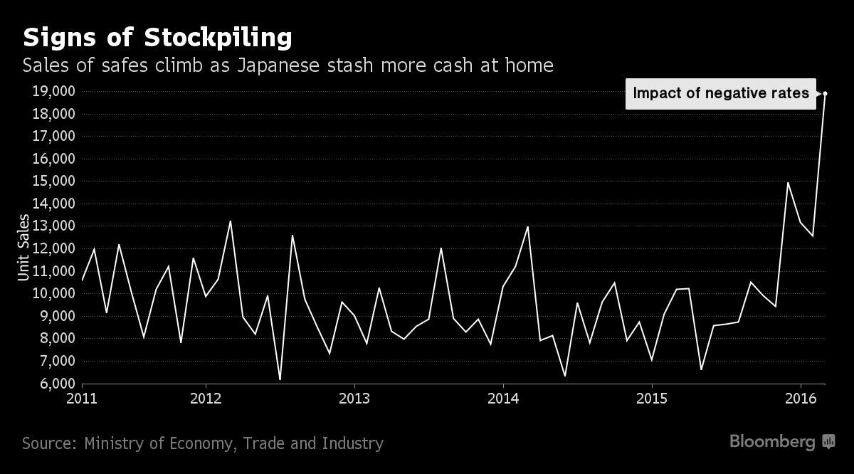 Financially, there’s little that separates the futon from a savings account that pays 0.001 percent annual interest. And perceptions that a negative deposit rate could become a tax on savers has exacerbated the migration of funds. Sales of safes in March were the highest in government data going back five years, and paper money exceeded coins in circulation by the most last month in BOJ figures to 1970.